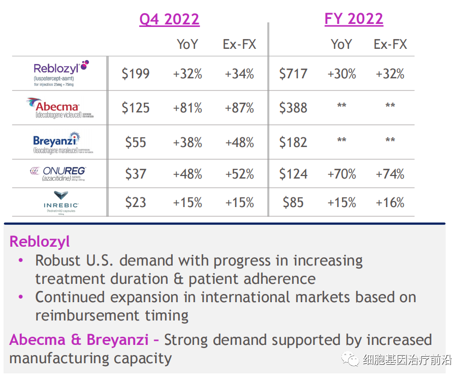 百时美施贵宝(BMS)的两款CAR-T疗法Abecma和Breyanzi,在2022年分别营收3.88亿美元和1.82亿美元。在第四季度,Abecma营收1.25亿美元,同比大涨81%;Breyanzi营收0.55亿美元,同比增长38%。