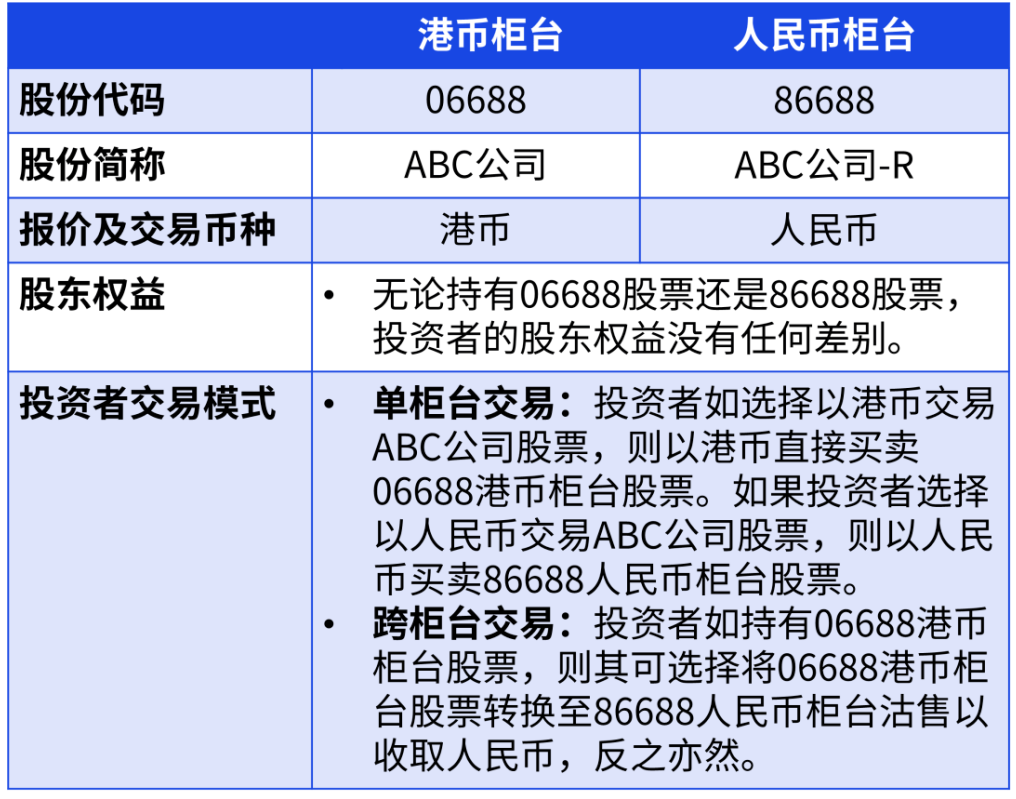 双柜台模式是指上市公司股票同时设有港币和人民币两个交易柜台,分别以港币和人民币两个币种进行报价、买卖及结算。虽然币种不同,但港币和人民币股票均为同类别股票,在股东权益上无任何差异,且可以在两个柜台之间相互转换。