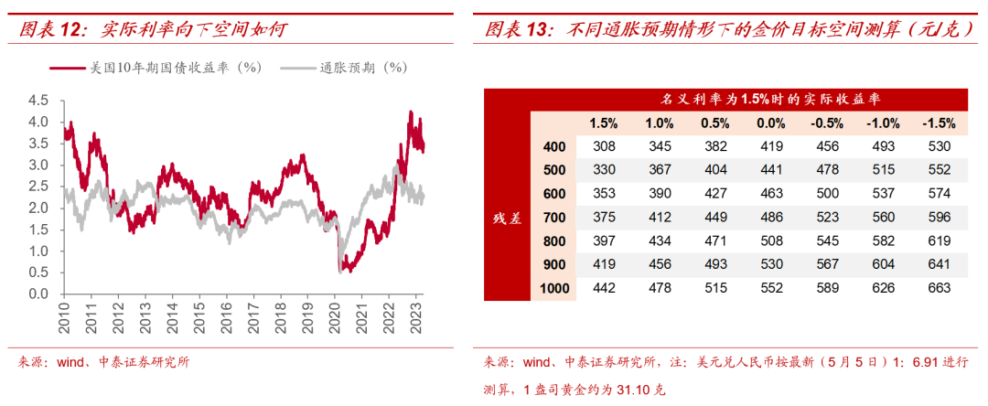 问题四:如何测算本轮黄金行情的上行空间?我们认为在经济下行压力、银行体系风险等不断增大背景下,市场预期下半年美联储将进入降息周期,当粘性高通胀遇上降息周期开启,通胀中枢将面临被动抬升的风险,而这或将最终导致实际利率中枢超预期下移,进而不断推升金价,并且短端粘性通胀又将带来不同的残差值从而加大金价的上行波动空间。