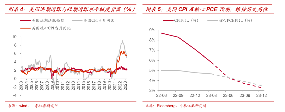 就本轮周期来看,美国CPI同比从去年高点的9.1%回落到目前的5.0%,核心CPI同比数据从去年高点的6.6%回落至目前的5.6%,但纵向对比,目前的通胀仍显著高于历史平均水平,同时由于供给端因素(如劳动力市场等)制约,核心通胀具备较高粘性,目前市场一致预期美国CPI在年底前都将在3%以上,也不排除美联储最终上调通胀目标管理区间的可能。