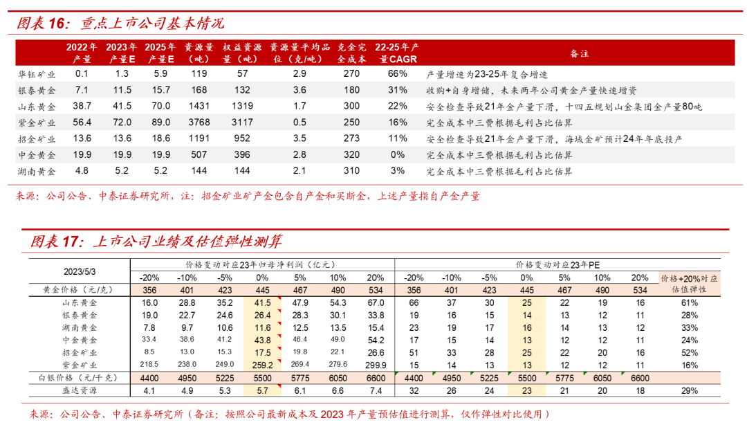 问题六:又将如何看待黄金股的上涨空间?据前所述,随着美联储加息周期逐步进入尾声,金价后续将进入降息预期驱动的上涨阶段,而当前美国面临历史性的高通胀,或导致远期美国通胀中枢的抬升,金价仍将具备显著的上涨空间,不论从时间或空间上来看,黄金上涨趋势均未结束,而随着黄金上涨行情的展开,资源优势及成长优势突出的标的将具备显著投资价值,我们梳理重点公司弹性如下: