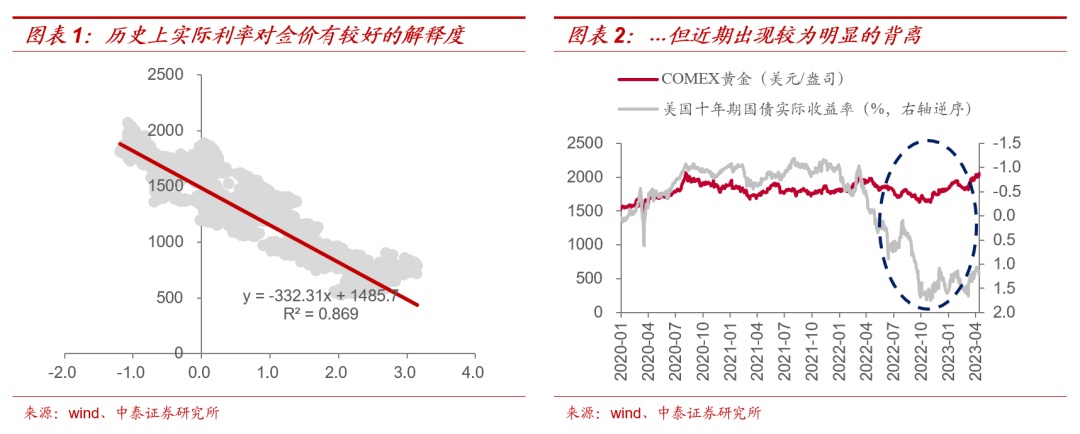 问题一:美国长期实际收益率和金价的关系出现显著背离,传统方法论模型定价是否失效?历史上(2006年至今)美国长期实际收益率(即十年期通胀保值贴补债券收益率TIPS)对金价有很好的解释度,通过拟合历史数据也能发现,两者具备较强的负相关关系,且线性拟合的拟合优度达到86.9%。但去年下半年至今,两者发生了大幅偏离,比较明显的表现是2022年8月至今十年期美债的实际收益率从0.09%上升至1.32%,而同期COMEX黄金价格从1769.7美元/盎司上涨至1995.3美元/盎司,两者呈现出一定的正相关性,这和市场公认的负相关关系的认知产生较大偏离,十年期美债实际收益率定金价的模型是否失效?