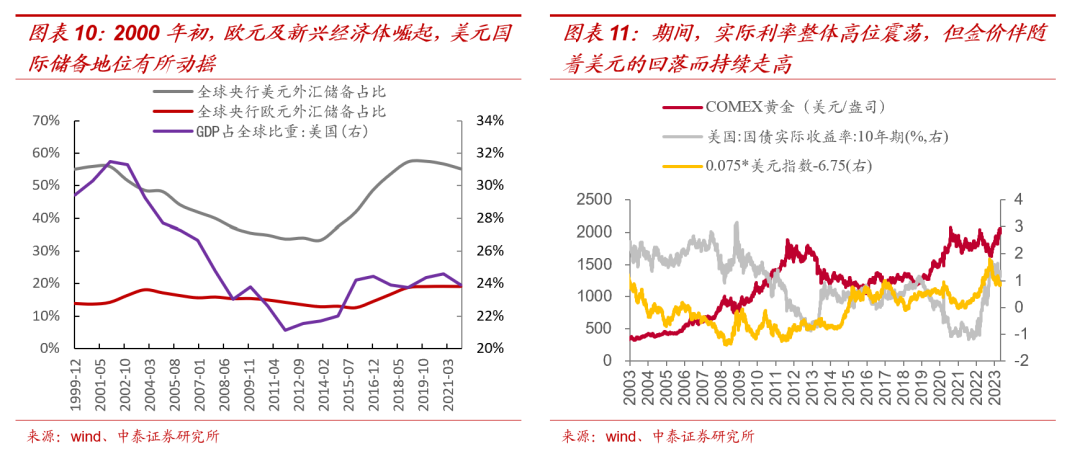 复盘2000年初,一方面欧元于1999年1月1日诞生,并在2002年开始欧元取代各国货币而成为欧洲统一货币,全球央行的欧元储备占比快速从14%提升至18%,冲击一部分美元储备,另一方面2000年初开始,新兴经济体快速发展,美国GDP的全球占比从2001年的31.5%见顶后不断走低,同时全球央行的货币储备中美元占比也持续走低,美元作为国际储备货币的地位有所动摇,我们看到2000年初的前五年,美债收益率基本稳定,但美元指数持续走低,金价则出现了持续的上涨行情,并且一直到2006后,金价与实际利率才表现出稳定的负相关性。