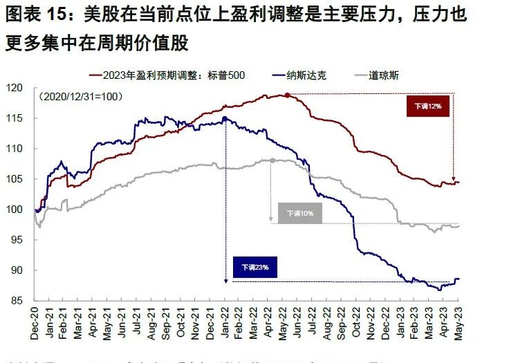 **市场:对通胀路径预期比美联储乐观,且并不认为美联储会“动真格”的大幅重启加息。根据Bloomberg一致预期,市场预测到年底核心PCE回落至3.6%、失业率4.2%,联邦基金利率5.2%,与美联储有较大偏差。资产表现也体现了这一差距。例如FOMC会议后,CME利率期货仍旧定价7月为年内最后一次加息,美债利率尤其是受政策影响更多的短端利率(3~6个月)延续下行,均在5.2%左右;美股尤其是纳斯达克反而继续上行。