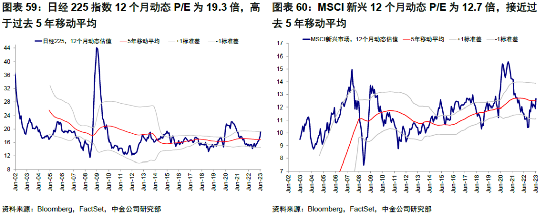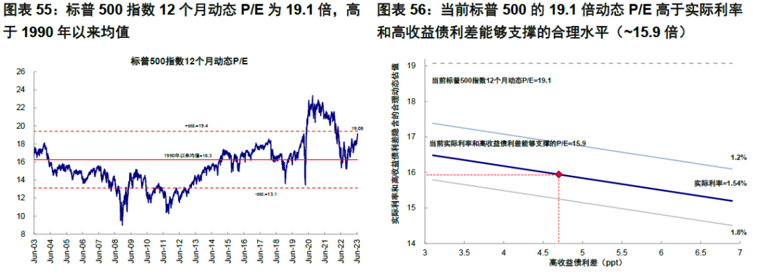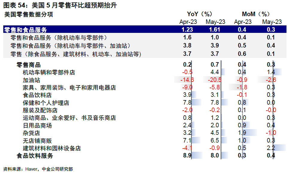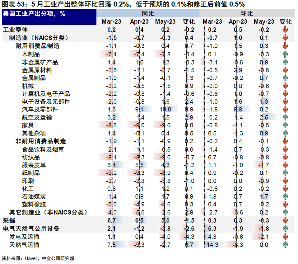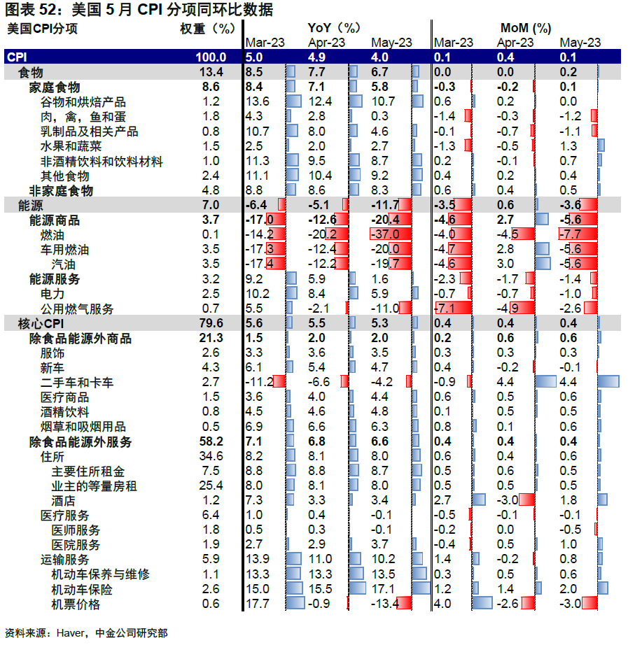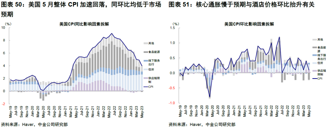 这一背景下,此次点阵图调整,可以理解为两层用意:一是对美国经济今年上半年已经呈现的超预期韧性的追认(上一次经济数据预测因为恰逢3月SVB事件爆发不久,因此给出的经济数据预期较为谨慎),因此在6月做出修正;二是该路径可能也是美联储内部鹰派成员观点折中的结果。本次点阵图中,有9位与会者预计加息终点为5.625%,两位预期为5.875%,还有一位给出的预测为6.125%。但这些鹰派与会者都一致同意6月“跳过”加息。