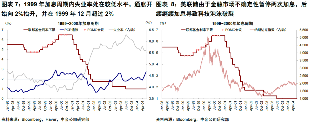 **1999年科技泡沫前的加息周期,期间两次暂停后再重启。美联储从1999年6月到2000年5月累计加息175bp(从4.75%抬升至6.5%),最后一次加息50bp,期间两次暂停后再重启。宏观环境上,当时失业率处于低位,通胀低于2%但向上抬升,并在1999年12月超过2%,科技股直到加息尾声前强劲上涨。根据会议纪要,美联储始终强调供需不平衡可能损害经济可持续性增长,且有通胀风险,但金融市场存在不确定性。美联储在1999年10月暂停加息,以评估供需问题和金融市场的信息,但称此次停止不意味对未来行动的承诺。11月因为看到了失业人数进一步下降和经济活动扩张,美联储继续加息以防范通胀风险。1999年12月再度暂停加息,虽然美联储强调依然担心通胀问题,但暂停主要是出于跨世纪时点可能产生波动的谨慎处理。进入2000年后,抗通胀再度成为主要矛盾,美联储随后持续加息100bp。紧缩政策下,PCE在2000年3月达到2.9%高点后开始回落企稳。收紧的金融条件也使得美股科技泡沫于2000年3月破裂,美联储在5月以最后一次50bp加息停止了本轮周期。